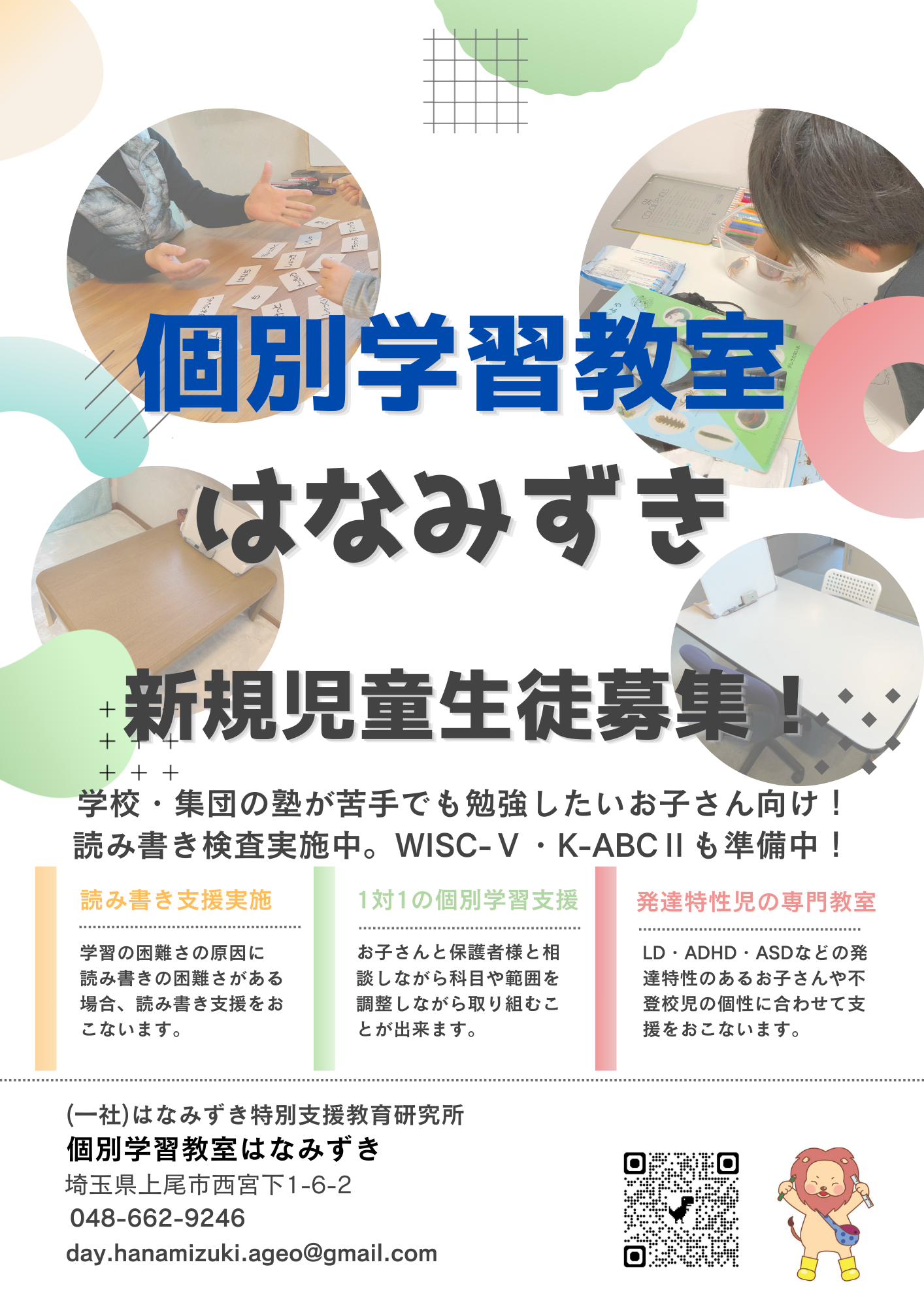 ・『読み書き教室』は『個別学習支援室はなみずき』へリニューアル致します。今後は学習支援にもより力を入れてまいりますので、是非ご相談ください。詳しくはこちら。